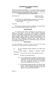 Andhra Pradesh Government Order Order Type: Manuscript Order Number: 66 Date: 2011-07-15 Department: EHE01 - HIGHER EDUCATION Category: Others Section: EC Order Source: URL Abstract: GOVERNMENT OF ANDHRA PRADESH ABSTRACT HIGHER EDUCATION DEPARTMENT – The Andhra Pradesh Integrated Common Entrance Test for Admission into MBA and MCA Professional Courses Rules, 2004 – Amendments– Orders – Issued. HIG