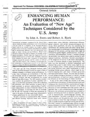 Approved For Release 2000/08 k8+otCdAA4RDR96s00789R00 .016g6~O1-6 ~~?ww~ w~~w.w~i ~ w is ap- re I). legit- icture APS terlap x peri- -alth- hat is :Areas eem- o the f De- t,PA. Iged. ewer was tune, pfidltin, nerican Human tall, 1.. !anizing Techniques Considered by the U.S. Army by John A. Swets and Robert A. Bjork General Article ENHANCING HUMAN PERFORMANCE: An Evaluation of "New Age" ilnrom'enti