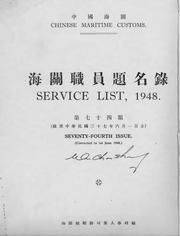 Chinese Maritime Customs, Service List . Seventy-fourth issue (corrected to 1st June 1948). Compiled by Staff Secretariat, Inspectorate General of Customs, 1948.