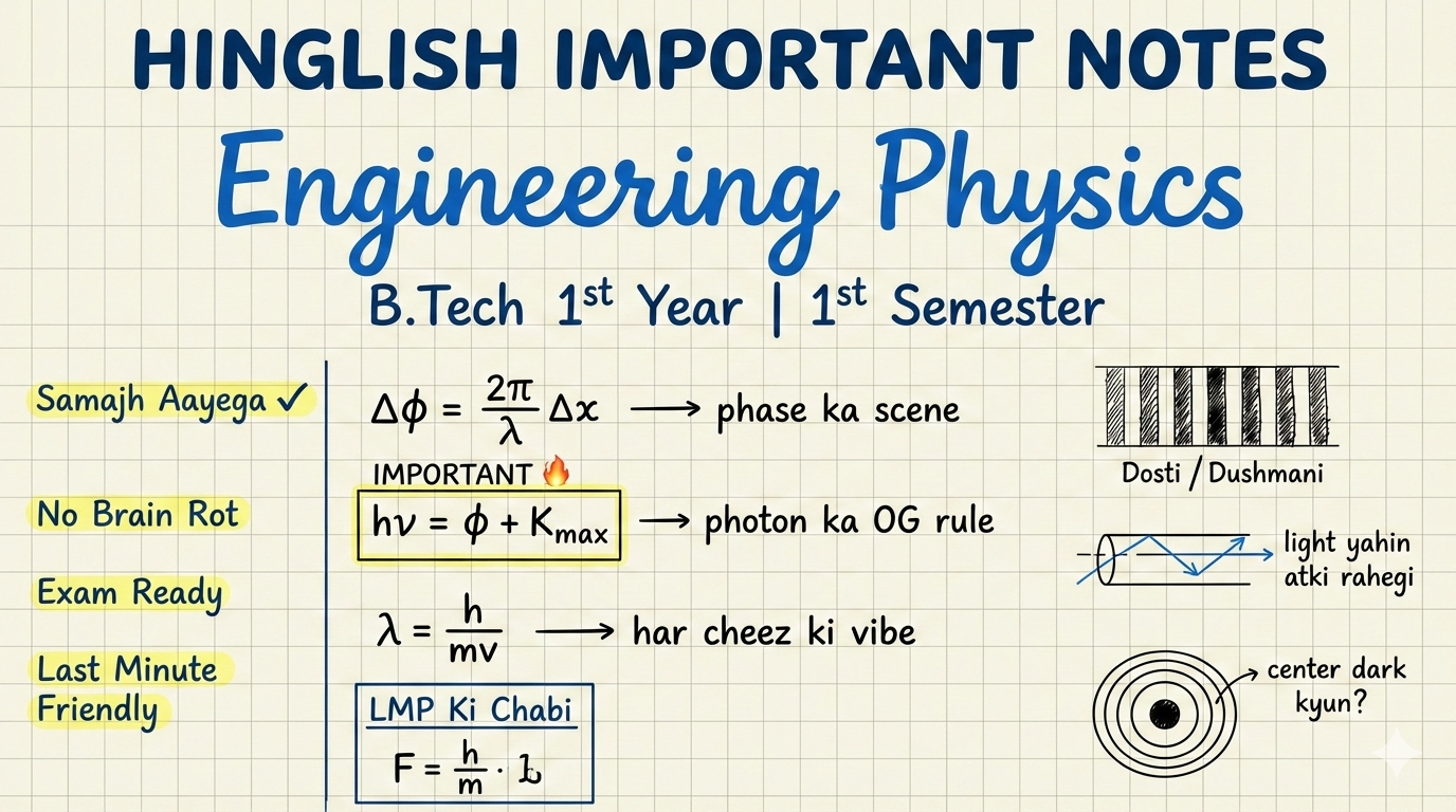 Engineering Physics Hinglish Important Notes PDF is specially designed for B.Tech 1st Year (1st Semester) students who want clear concepts, exam-oriented preparation, and last-minute revision without brain rot.
