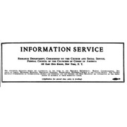 Information Service was a newsletter that covered religious, social, and cultural issues in the context of Christian faith and church activities. It was established in 1920 and was published bi-weekly, (except July & Aug., and monthly in Nov.), by the Central Dept. of Research and Survey, National Council of the Churches of Christ in the United States of America until 1969. The publication aimed t