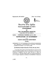 Telangana Gazette Date: 2015-7-9 Gazette Number: 28 Gazette Type: Extraordinary Part: Rules Supplement to PART I Job Number: 207 Department: Higher Education / Commissioner Of Printing Subject: AMENDMENT TO THE TELANGANA REGULATION OF ADMISSIONS INTO MBA/MCA, PROFESSIONAL COURSES THROUGH COMMON ENTRANCE TEST RULES, 2006.