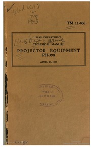 TM 11-406 Projector Equipment, PH-398, 1943-04-24 TABLE OF CONTENTS Paragraph SECTION I. GENERAL DESCRIPTION General Description and Application 1 List of Components 2 Technical Data 3 Physical Specifications 4 SECTION II. EMPLOYMENT Initial Procedure 6 Installation 6 Preparation For Use 7 Operation 8 Precautions During Operations 9 Adjustments for Field Upkeep 10 SECTION III. FUNCTIONING OF PARTS